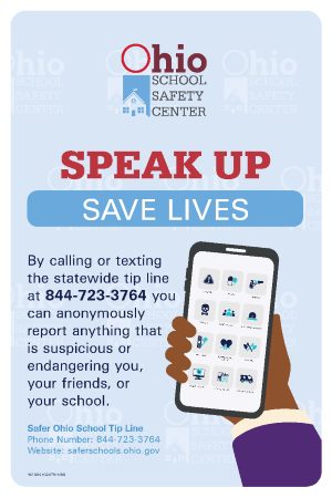 Students and adults can anonymously share information with school officials and law enforcement about threats to student safety via call or text to the Safer Ohio School Tip Line. Calls and texts are answered by Ohio Homeland Security. Students, parents, or staff who wish to report threats anonymously are encouraged to utilize the Tip Line for threats of mass incident or harm to a single student. To utilize this service: